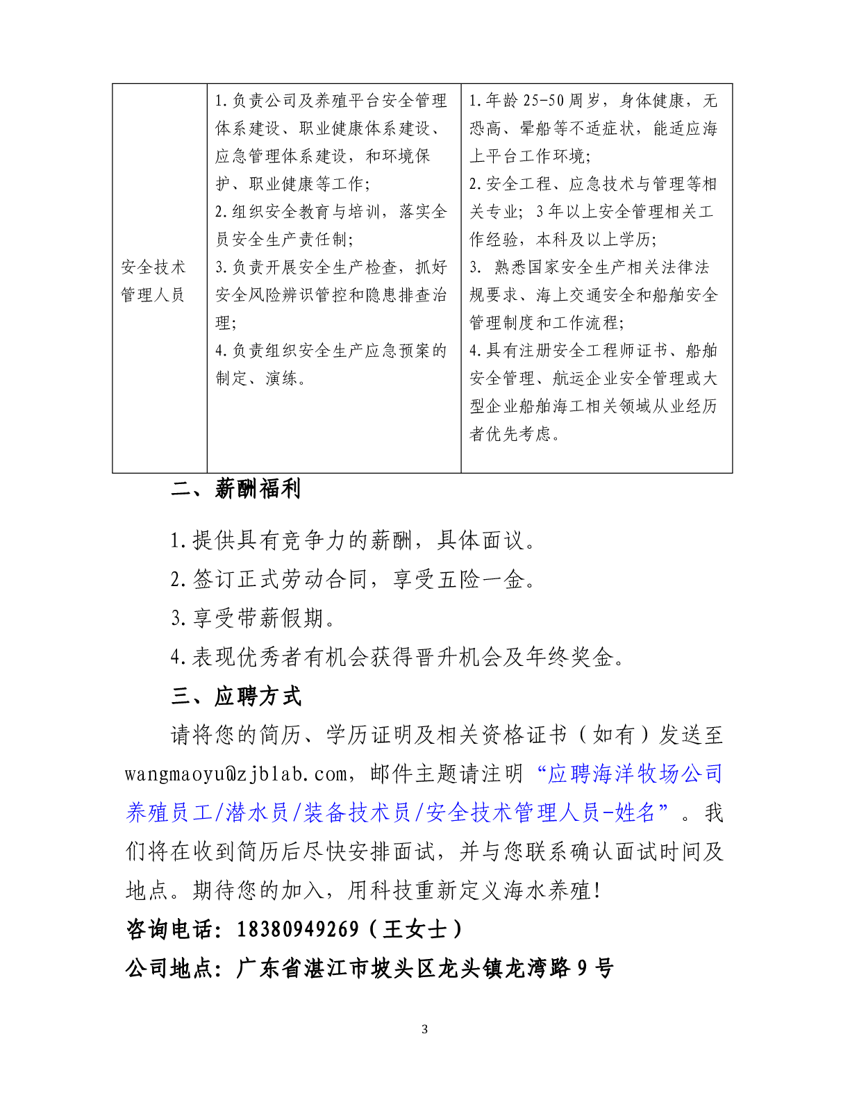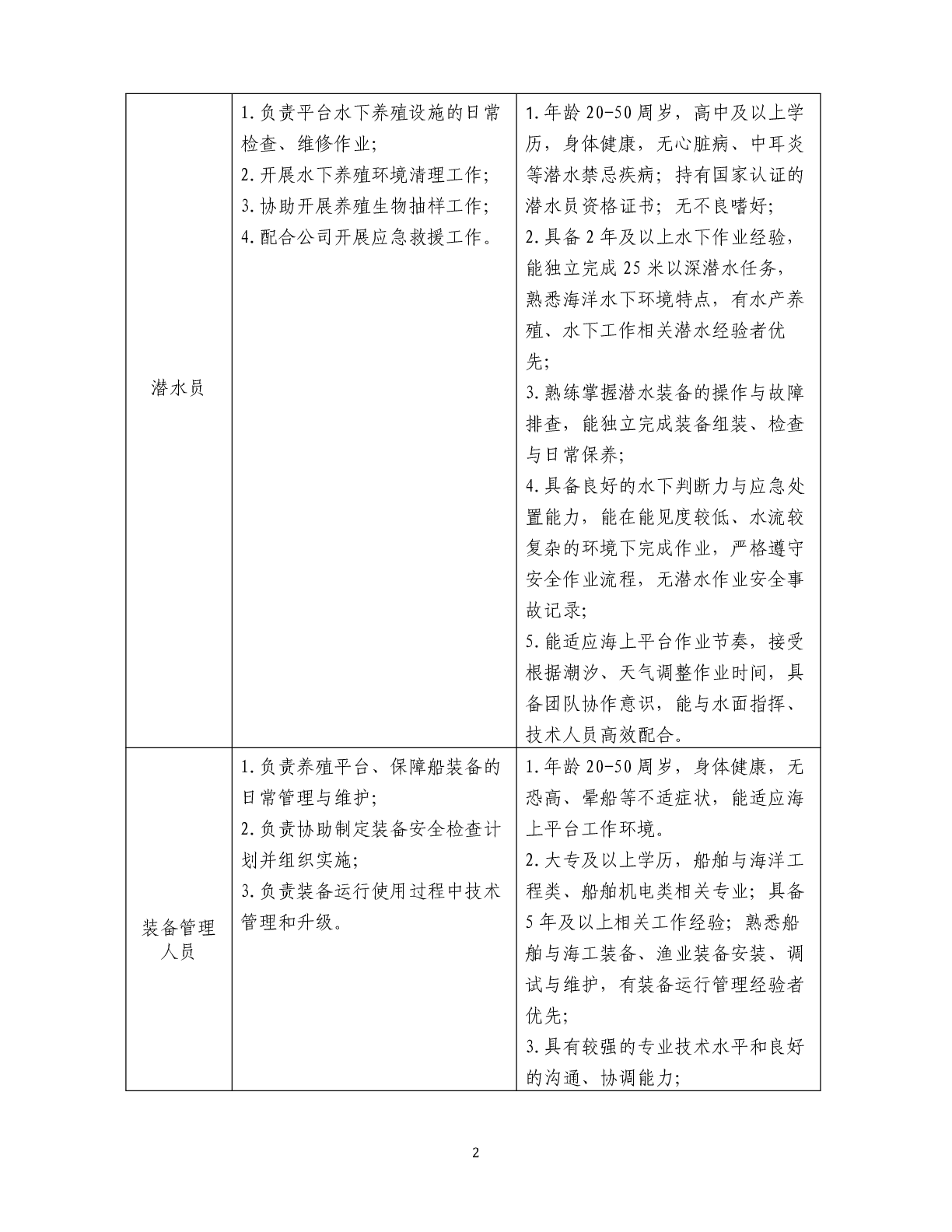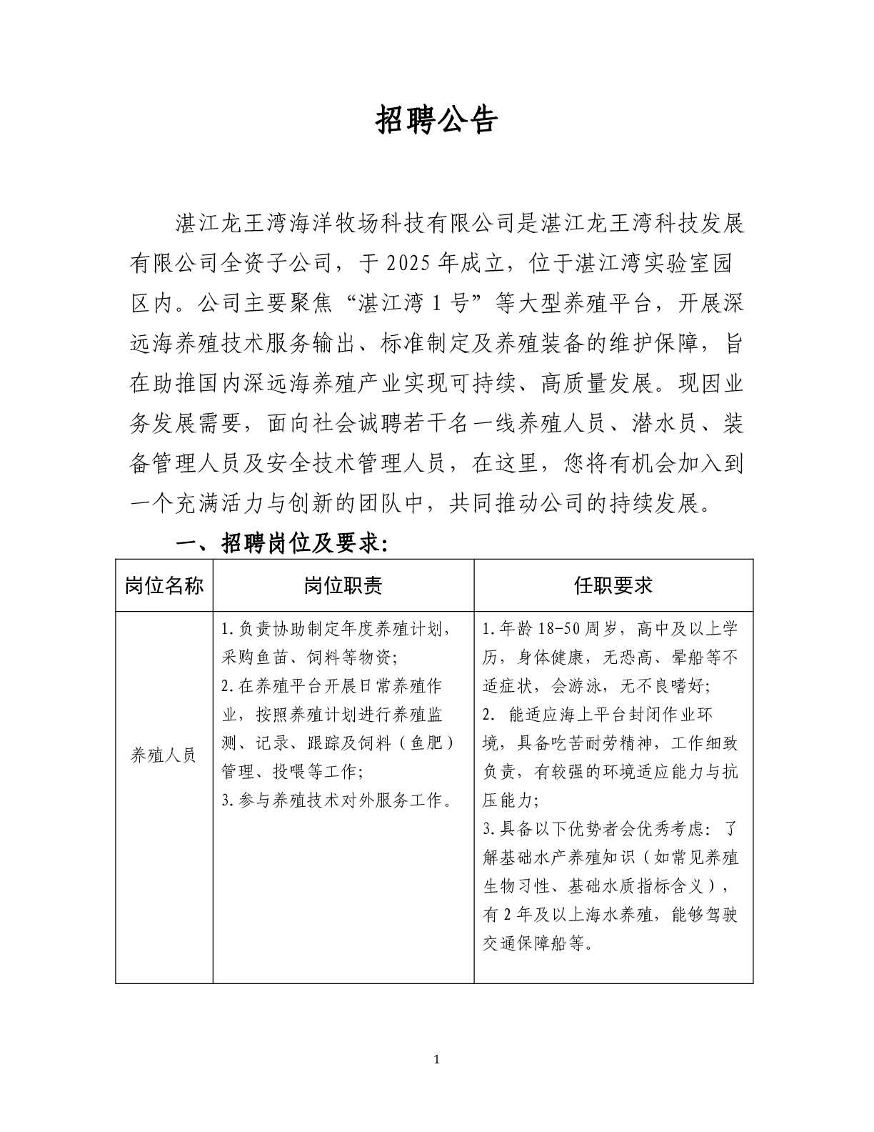 湛江龙王湾海洋牧场科技有限公司招聘人员公告